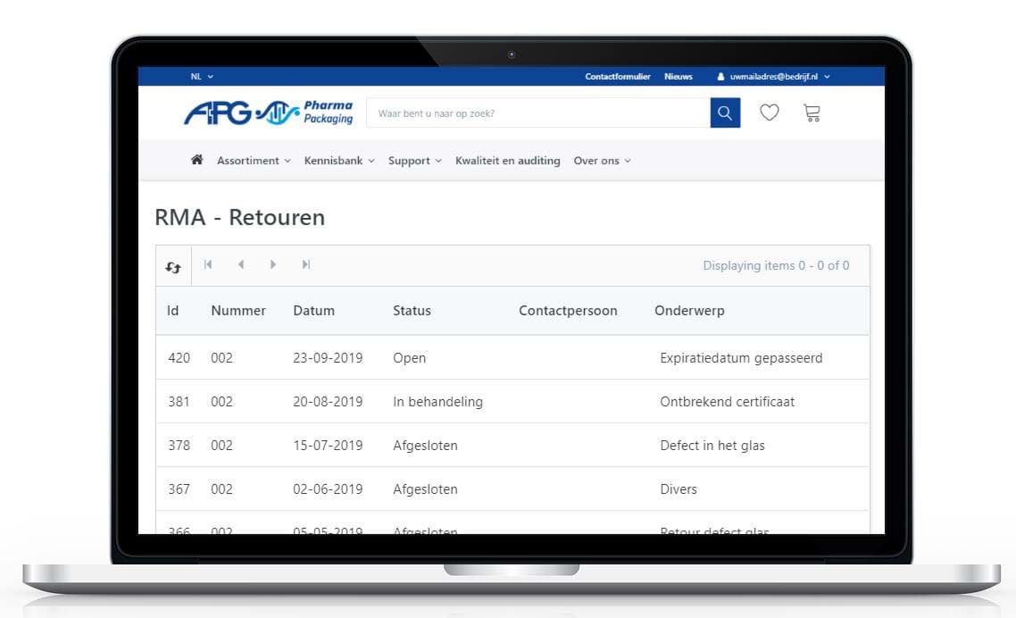 Uw RMA-aanvraag wordt geregistreerd in het TSRM managementsysteem. APG Europe maakt gebruik van een gestandaardiseerd RMA proces. RMA staat voor 'Return Material Authorization' ofwel de toestemming om goederen naar APG Europe terug te mogen sturen. Uw RMA-aanvraag met verzoek is vindbaar onder 'RMA - Retouren' binnen de Kwaliteit & Docs module. De voordelen zijn: